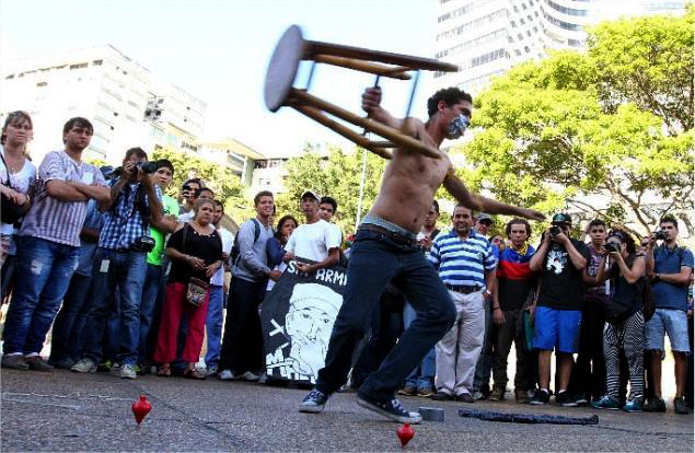 In the context of the protests, the red of the spinning tops and the tape in my mouth were easily understood by the audience as references to the Chavista governments and censorship.